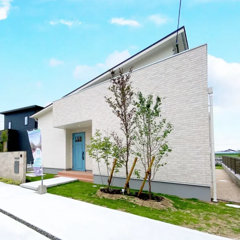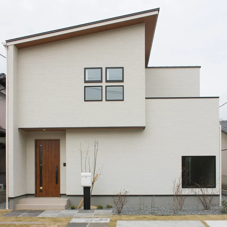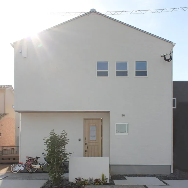 シンプル・ナチュラルをイメージした切妻屋根の可愛らしい家 真っ白な外壁に、玄関の木目調が映えています […] -