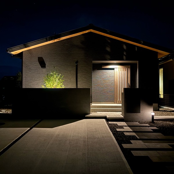 大胆な木目のアクセントが際立つ玄関アプローチ