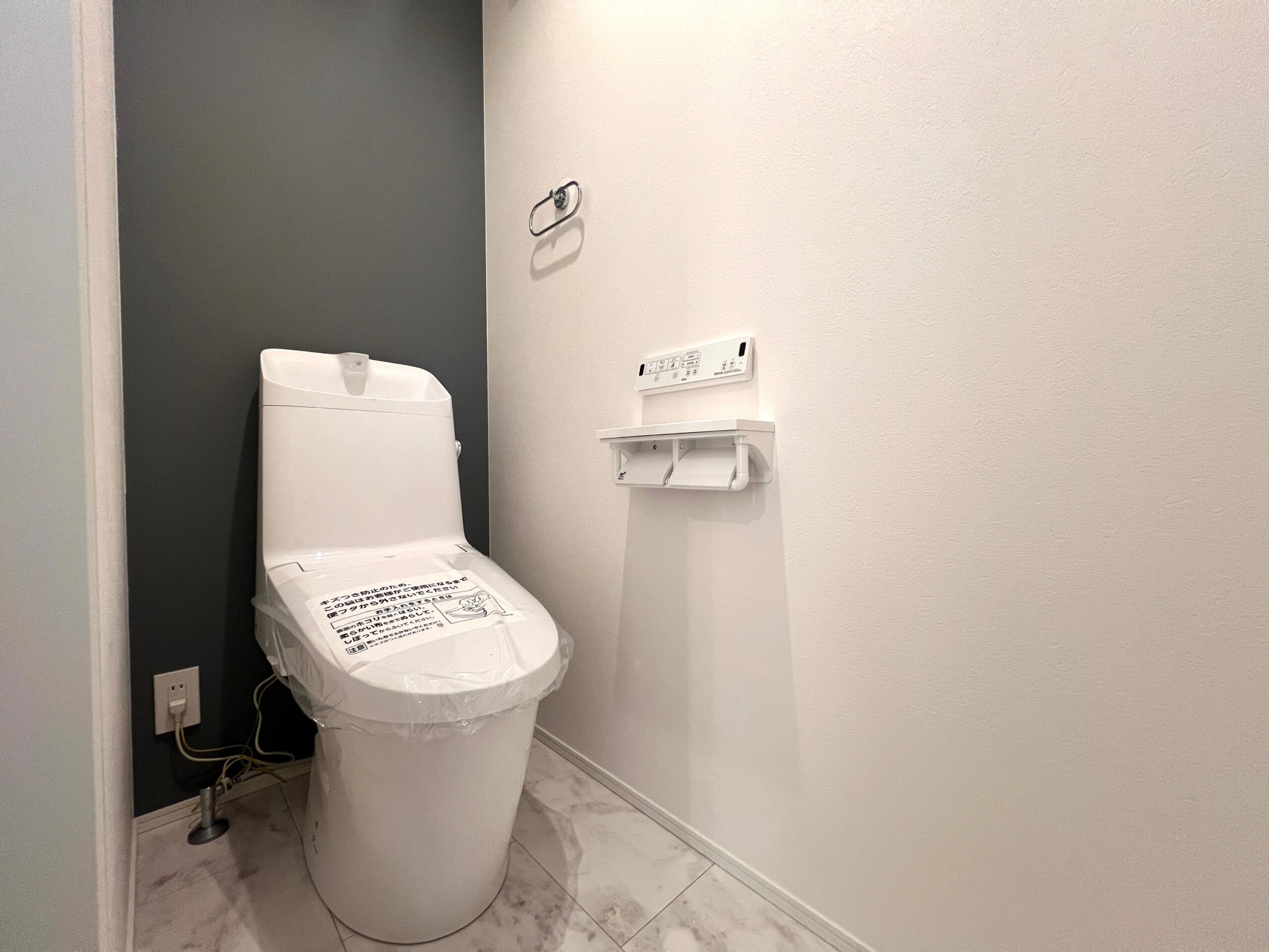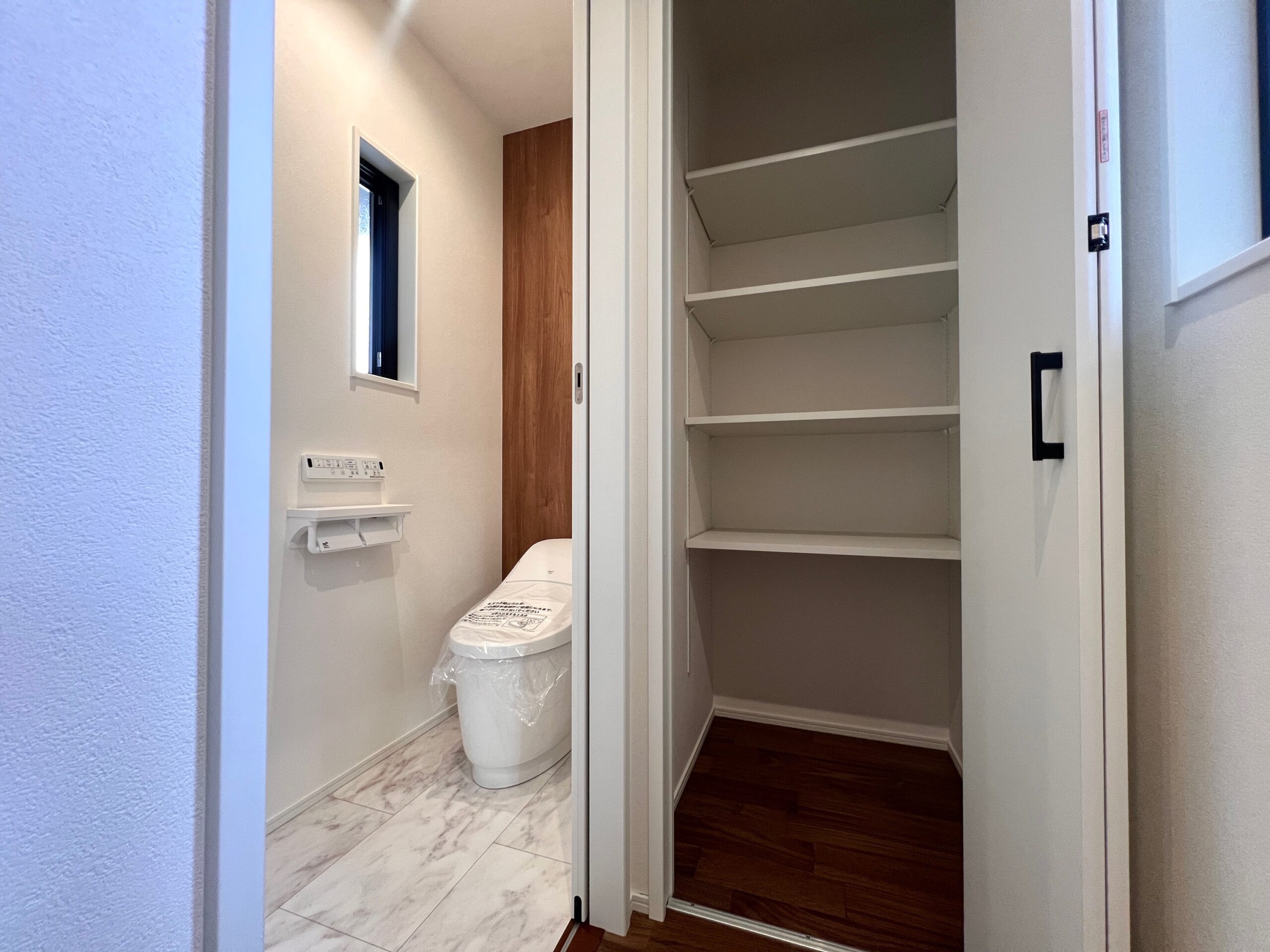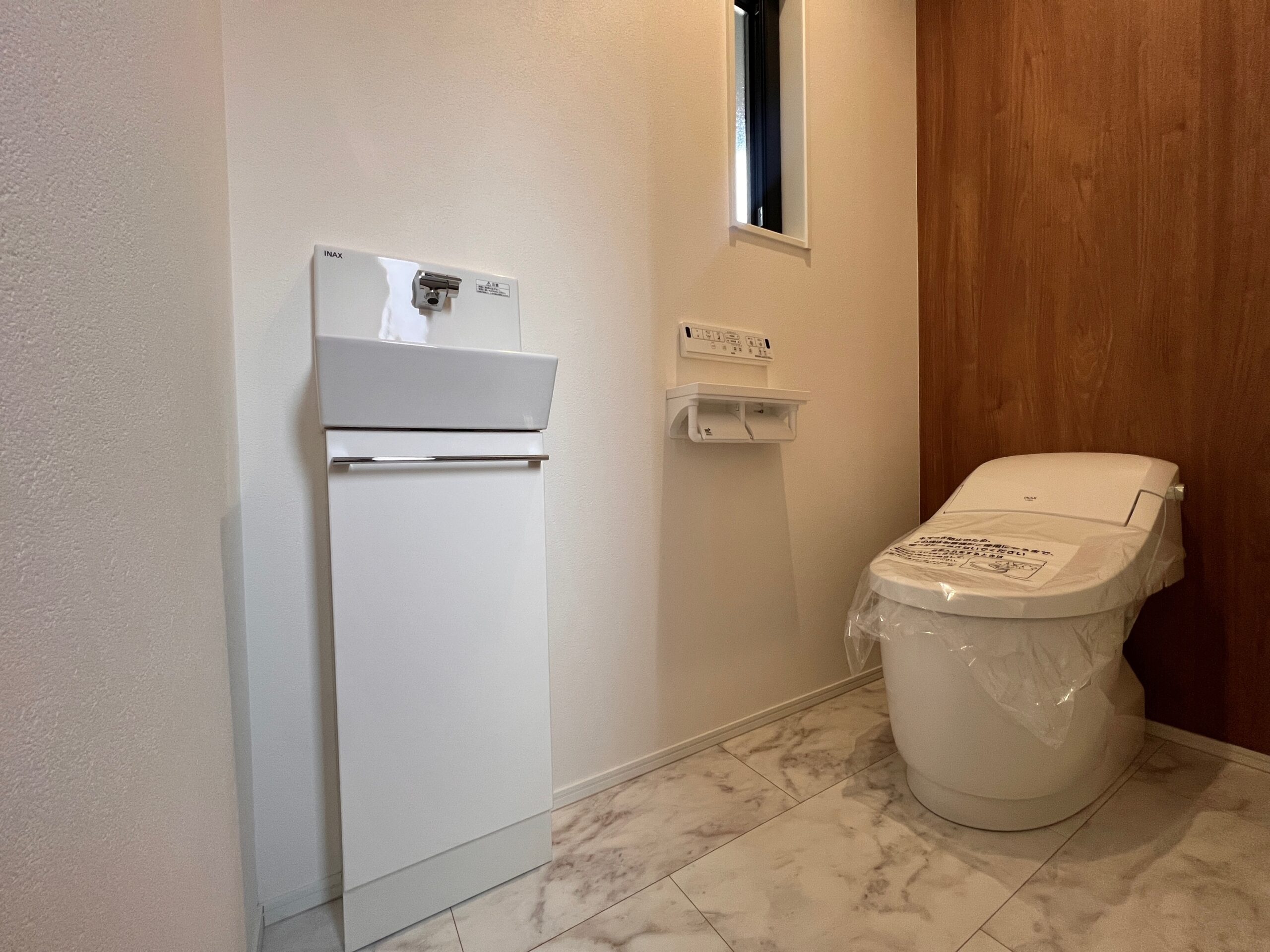 【2階トイレ:LIXIL INAX】1Fと同等の機能性・清掃性を備えた手洗い一体型トイレです。流線的なデザインで無駄のないコンパクトなフォルムが特徴です。