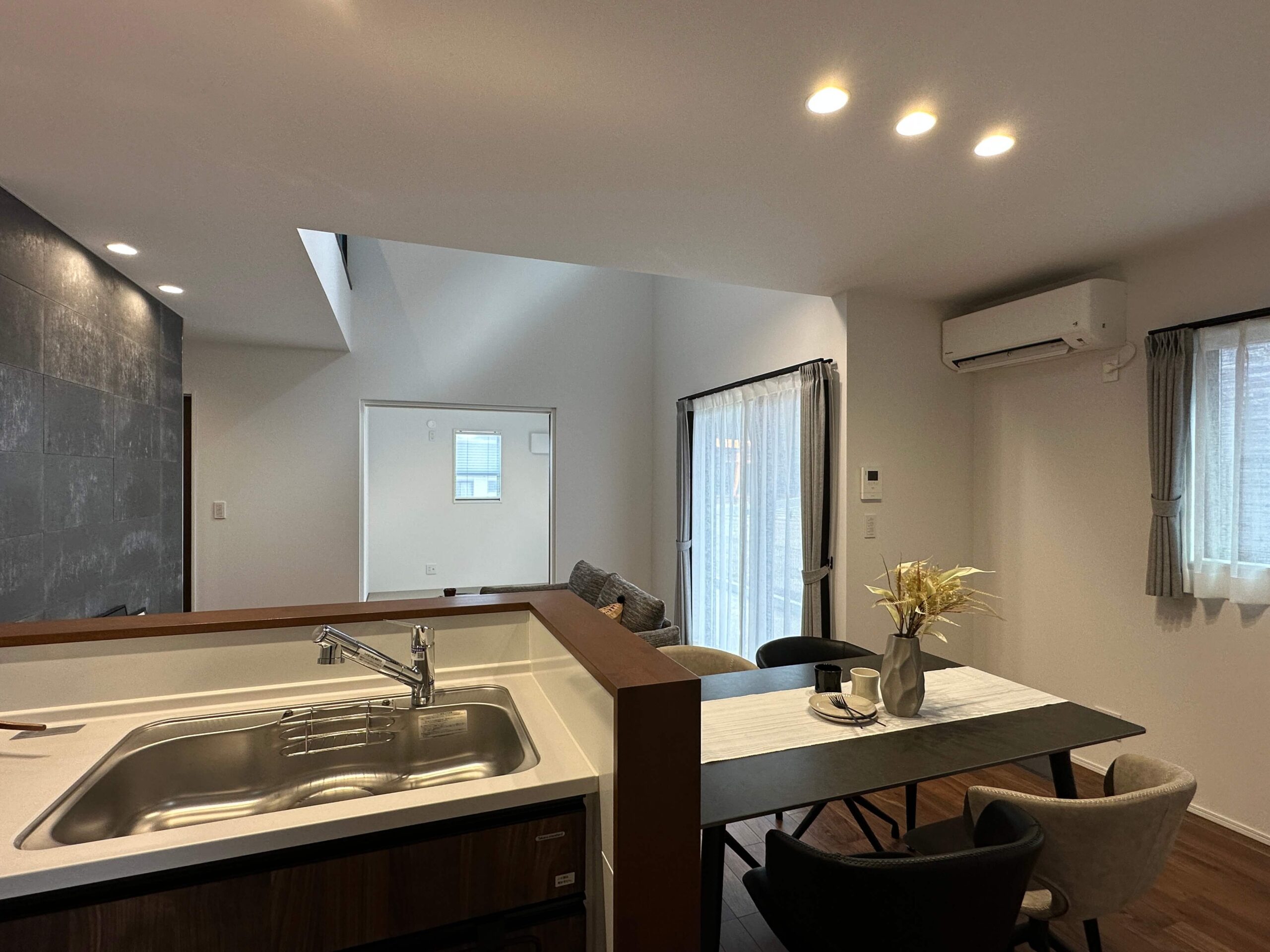 【即入居可】ネイビーのキューブ型外観のクール×スタイリッシュな分譲住宅。リビングが吹き抜けで階が違っても家中が心地良く繋がります。