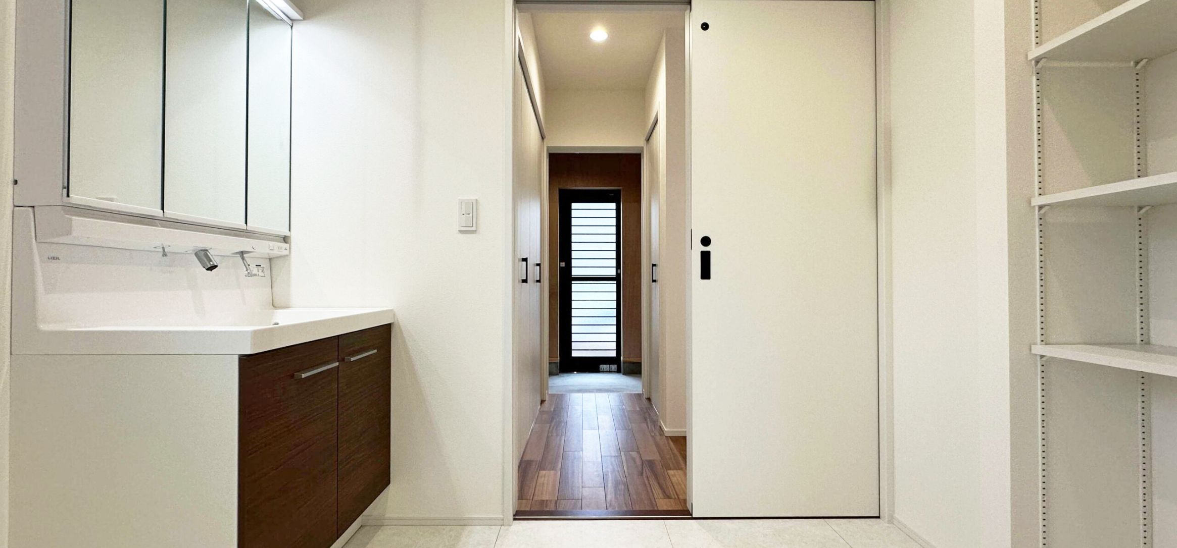 継ぎ目のないデザインで、汚れや水アカがたまりにくく、いつまでも清潔感をキープ。ハイバック仕様だから水栓まわりにも水がたまらず、お手入れもぐっとラクに。三面鏡の裏いっぱいに収納スペースを備え、外側1カ所、内側2カ所にコンセントを配置しています。