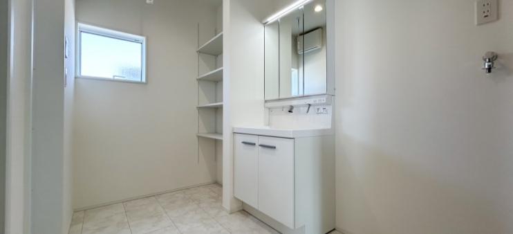 継ぎ目のないデザインで、汚れや水アカがたまりにくく、いつまでも清潔感をキープ。ハイバック仕様だから水栓まわりにも水がたまらず、お手入れもぐっとラクに。三面鏡の裏いっぱいに収納スペースを備え、外側1カ所、内側2カ所にコンセントを配置しています。