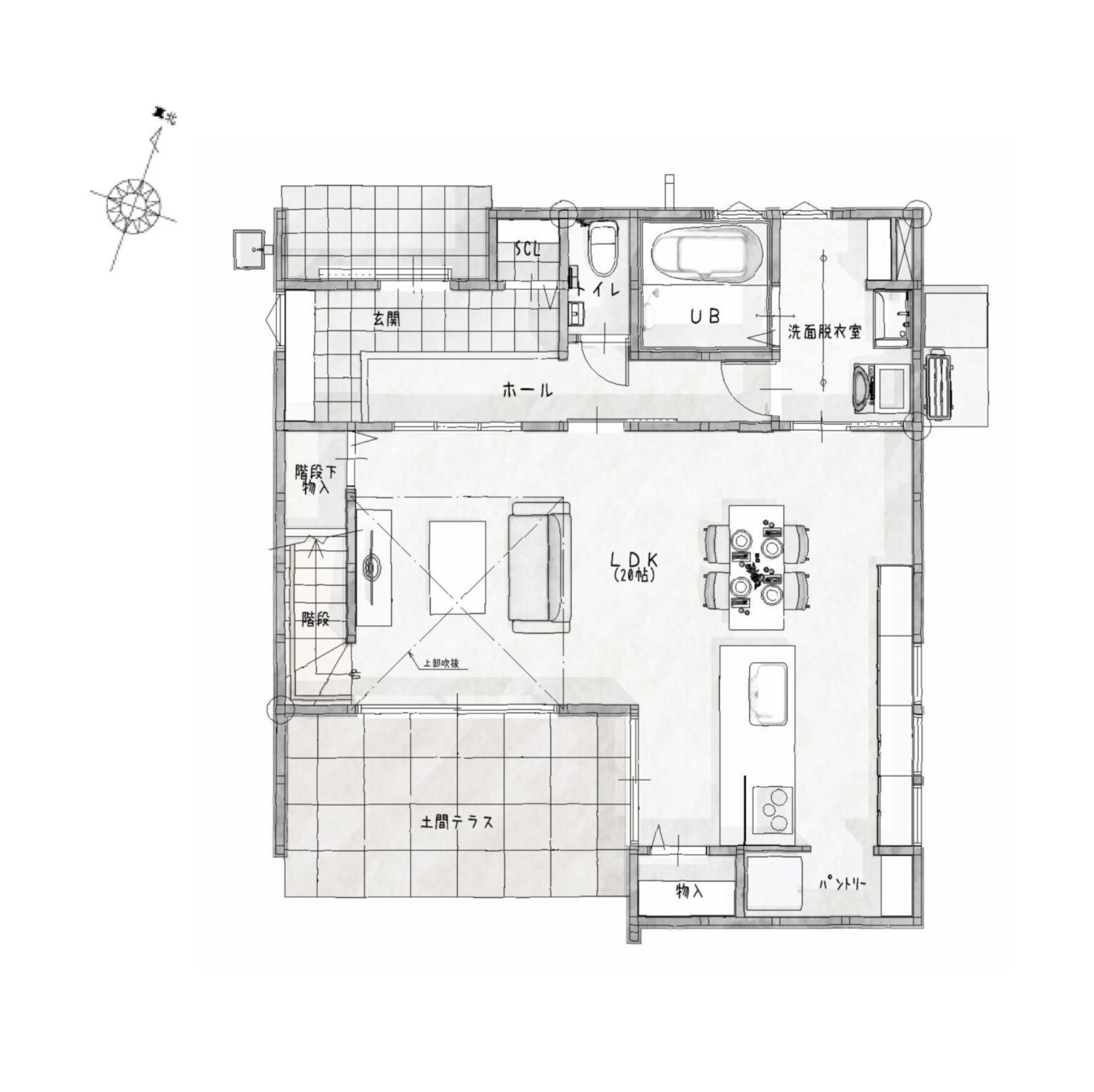 土間テラスと吹き抜けがつなぐ