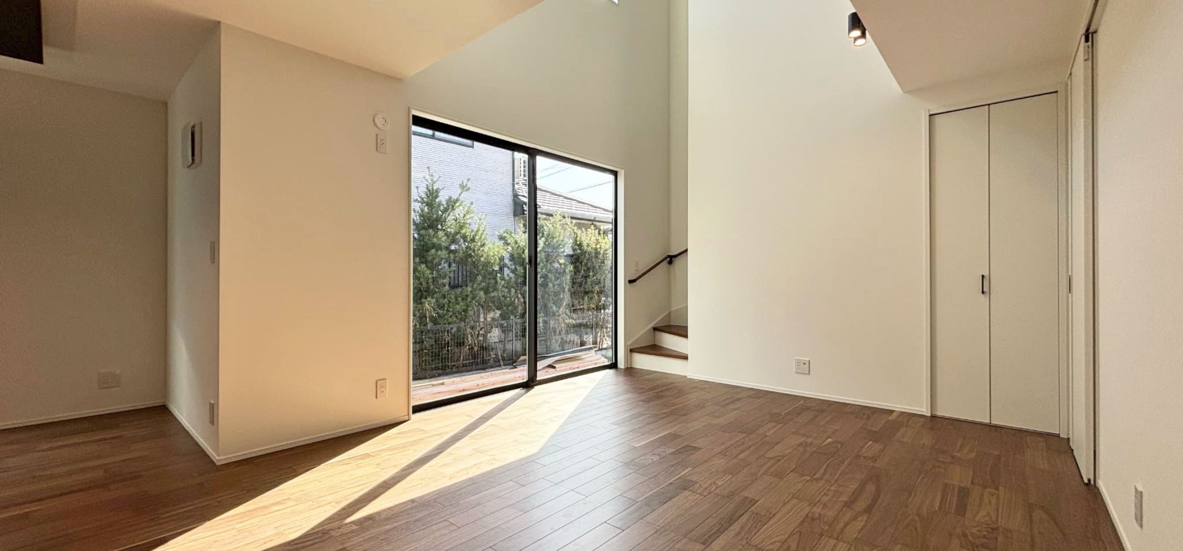 吹き抜けのリビングや大きな窓の向こうの庭まで見渡せる空間。
