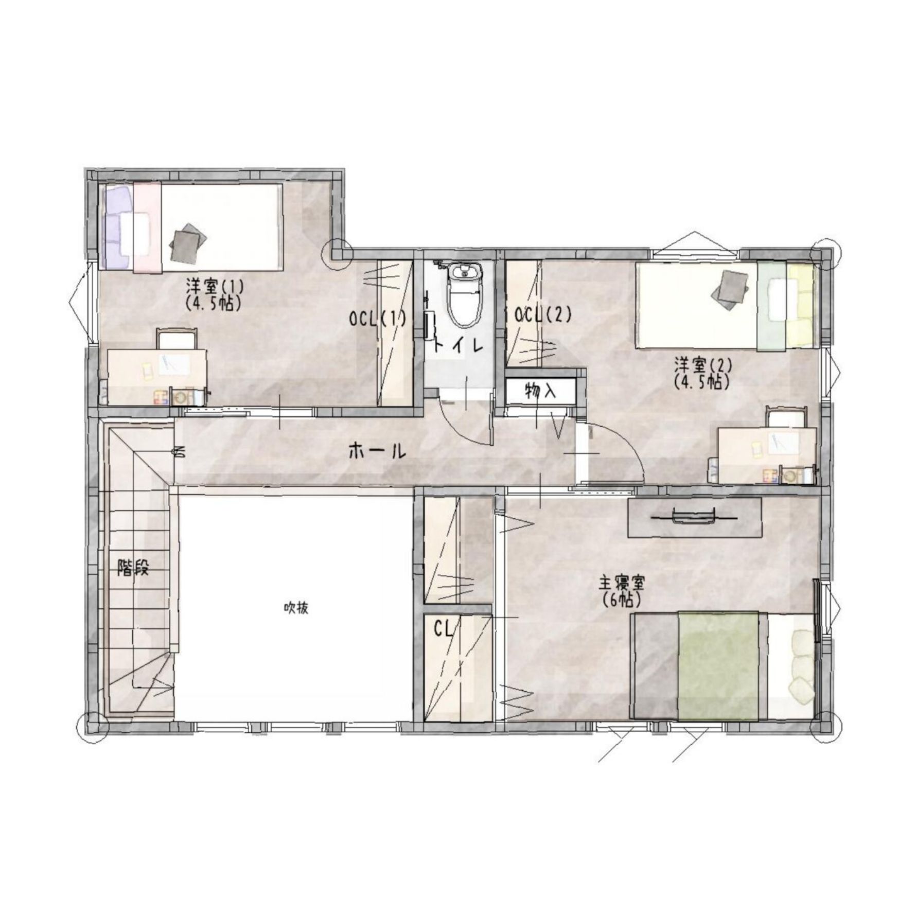 2階には主寝室と2つの洋室を配置し、