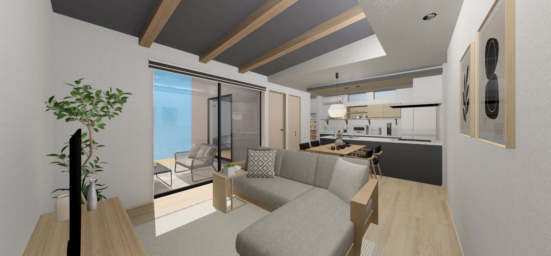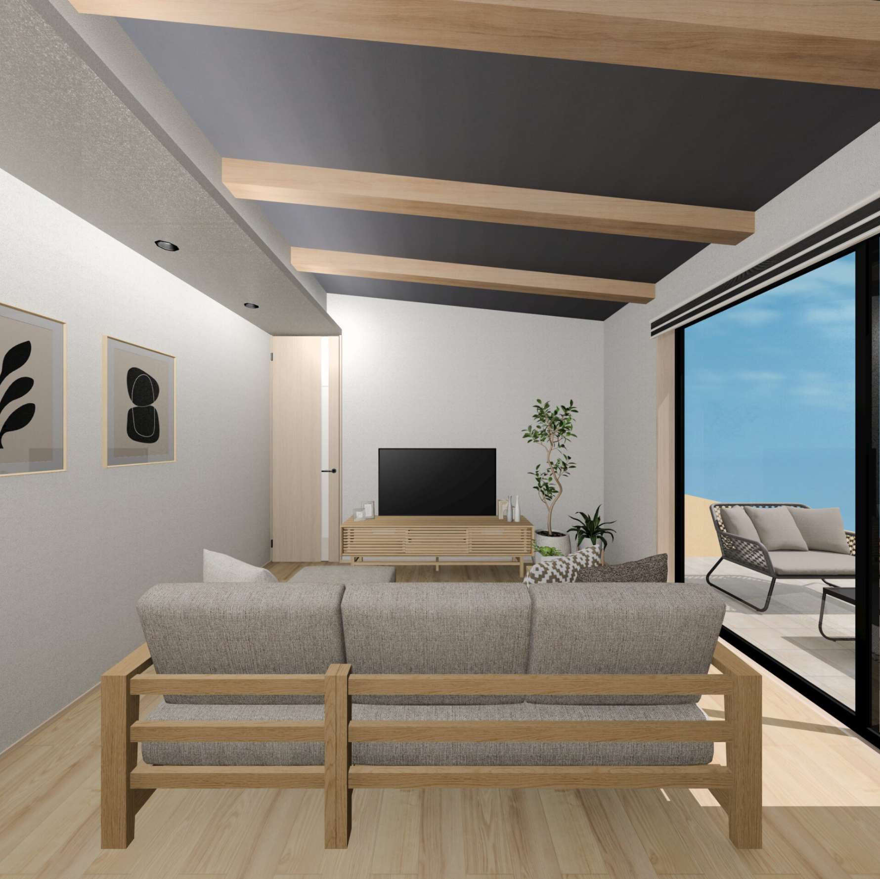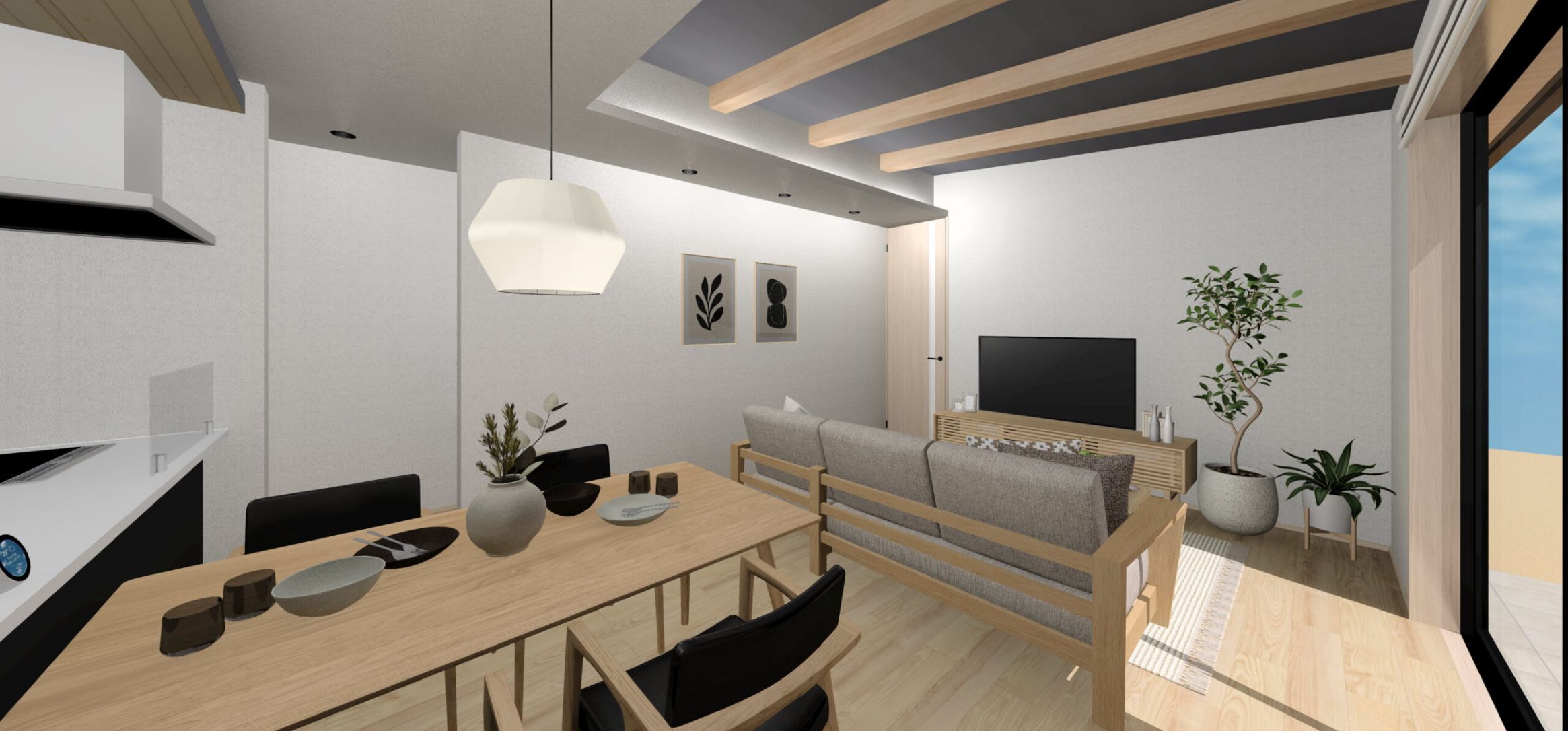 リビングには勾配天井と見せ梁を取り入れ、