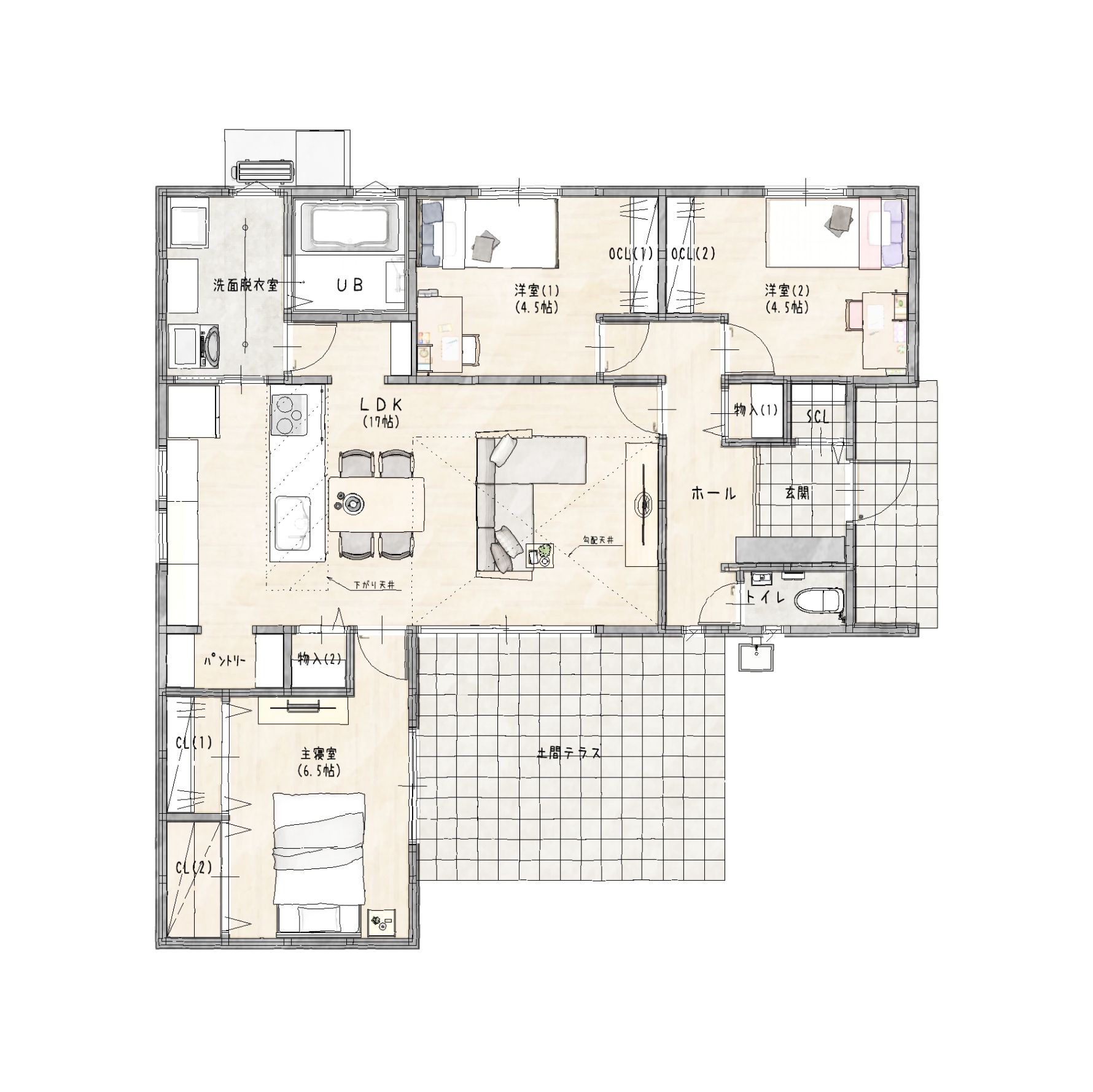 LDK約17帖 寝室約6.5帖 洋室(1)約4.5帖 洋室(2)約4.5帖