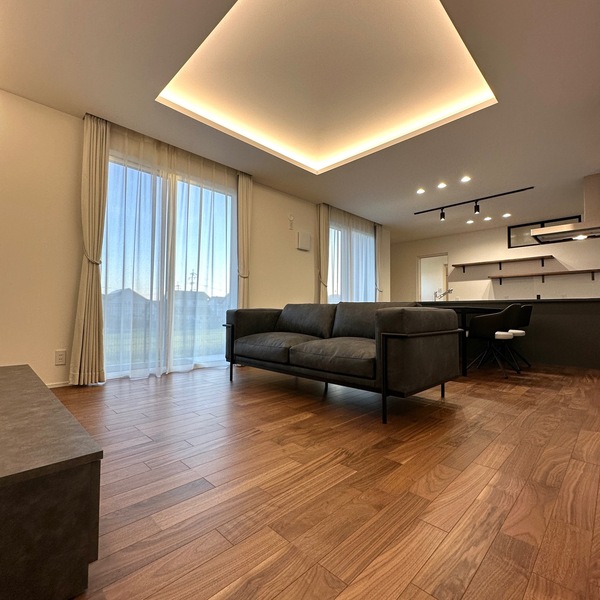 カーテン搬入しました。 折り上げ天井が上質なLDKの広がりを演出。 LDKとタイルデッキがひと続きに、一歩で風と光が纏うアウトドアリビングへ。...