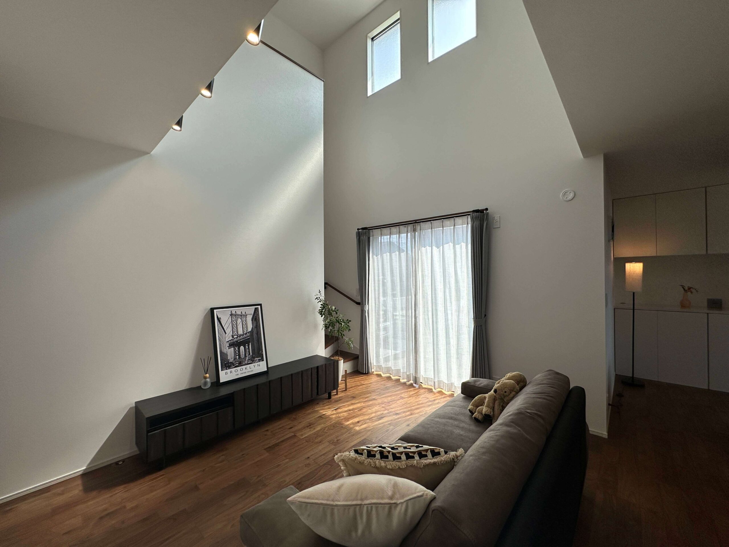 吹抜け天井が広がるLDK。2F寝室には広々とした書斎室を設けました。土地の形状を活かしたお庭で遊ぶことも◎ 0円ではじめるおトクな太陽光発電システム「シェアでんき」を導入...