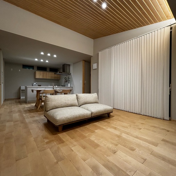 カーテン搬入しました。 折り上げ天井が上質なLDKの広がりを演出。 LDKとタイルデッキがひと続きに、一歩で風と光が纏うアウトドアリビングへ。...