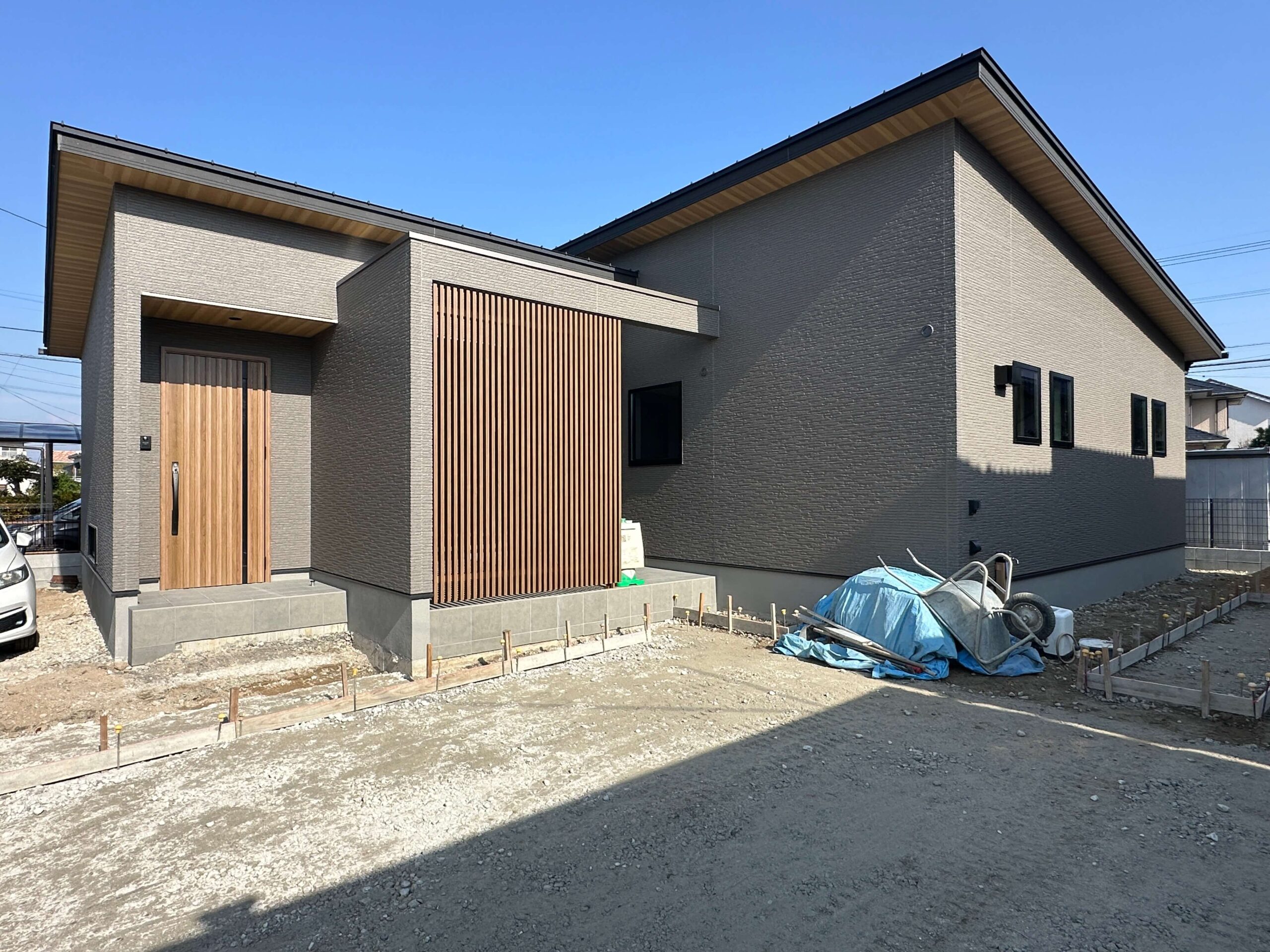 【外構工事中】自然美と上質感が共鳴する、くつろぎの空間。 0円ではじめるおトクな太陽光発電システム「シェアでんき」を導入した新築住宅です。...